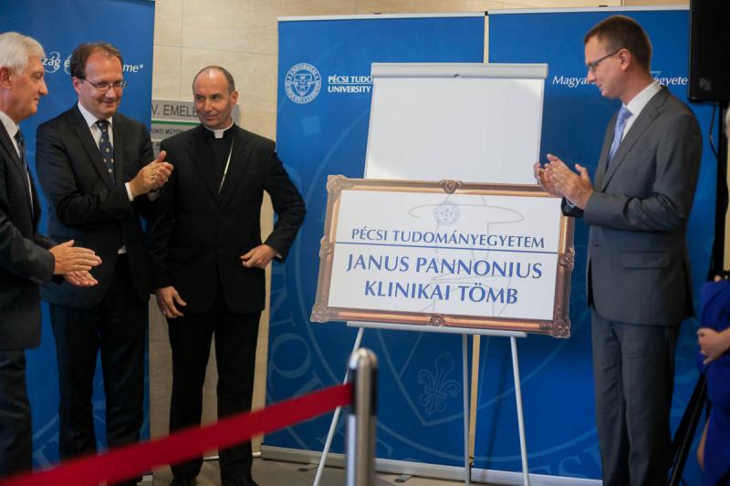 Ünnepélyesen is átadták a Pécsi Tudományegyetem Klinikai Központ 400 ágyas klinikai tömbjét. A teljes körűen felújított, modernizált, új műszerekkel felszerelt klinikai épületegyüttest Rétvári Bence, az Emberi Erőforrások Minisztériuma miniszterhelyettese, Hoppál Péter kultúráért felelős államtitkár, a kerület országgyűlési képviselője és Bódis József, a Pécsi Tudományegyetem rektora adta át. Az eseményen bejelentették, hogy az éves szinten közel félmillió beteget fogadó egészségügyi központot, melyet az ünnepség keretében megáldott Udvardy György megyés püspök, Janus Pannonius Klinikai Tömbnek nevezték el.